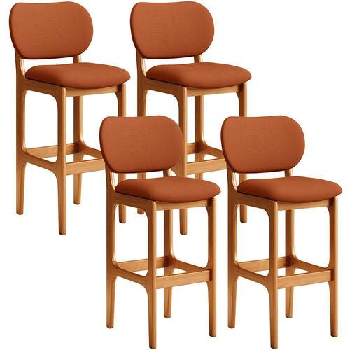 Amplamente sofisticada, o Kit 04 Banquetas Alta Bar Cozinha Sala Jantar Fixa Betta L02 Imbuia Tecido Terracota - Lyam Decor irá agregar ainda mais valor em sua decoração!! Sendo capaz de compor muito bem o ambiente, é produzida com materiais de excelente qualidade, a resistente estrutura em madeira de Taeda, na cor imbuia, conta com apoio para os pés (que garante maior segurança), além do assento e encosto estofados super confortáveis e convidativos, que são revestidos em tecido terracota, extremamente elegante.