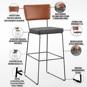 O espetáculo que é o Kit 04 Banquetas Altas Sala Jantar Fixa Allana L02 Couríssimo Camel Linho Cinza Escuro - Lyam Decor vem para agregar ainda mais valor na decoração da sua casa. Sua estrutura em aço remete-nos ao estilo industrial que surgiu em Nova York no século XX, já o assento e encosto estofados trazem equilíbrio e conforto criando a combinação perfeita para o ambiente.