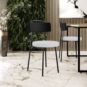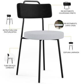 Revestimento do encosto em Couríssimo na cor Preto e do assento em Linho na cor Cinza, com acabamento semi brilho.