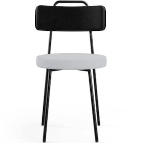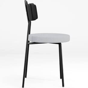 Revestimento do encosto em Couríssimo na cor Preto e do assento em Linho na cor Cinza, com acabamento semi brilho.
