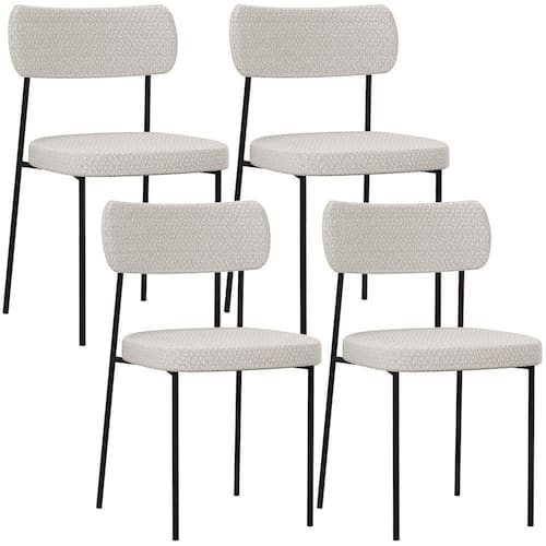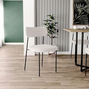 Encosto e assento estofados com espuma laminada. Estrutura fixa em aço carbono com pintura epóxi na cor preto. Revestimento em Bouclê na cor Cru. Peso suportado: Até 120 kg.