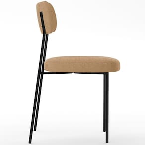Encosto e assento estofados com espuma laminada. Estrutura fixa em aço carbono com pintura epóxi na cor preto. Revestimento em Bouclê na cor Mostarda. Peso suportado: Até 120 kg.