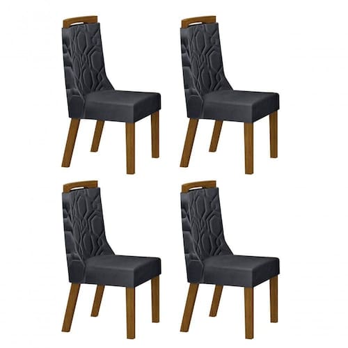 Mais Especificações técnicas: -Pés das cadeiras em Madeira -Assento estofado com espuma D-23 -Encosto estofado com espuma D-20, costura na frente e no verso do encosto -Aplique de MDF no encosto Ean: 7899306256807