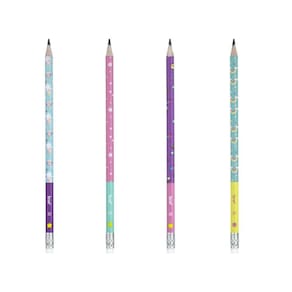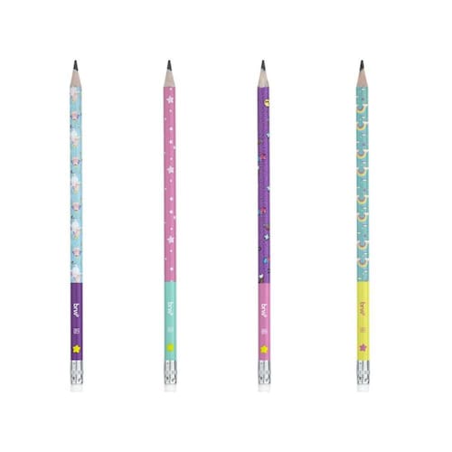 Os Lápis Grafites HB Magic BRW possuem corpinhos redondos com 4 opções de estampas fofas com tema de unicórnios, arco-íris, estrelinhas e emojis fofos, pontas resistentes e uma borrachinha no topo! O lápis é produzido em resina plástica, o que garante um apontar mais suave e escrita macia.
