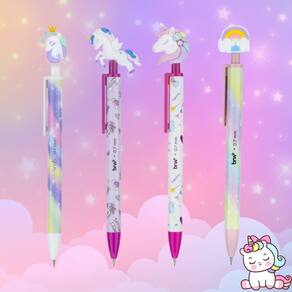 Com uma ponteira temática em formato de Unicórnios e Arco-íris, está lapiseira traz um toque criativo para o seu material escolar ou de escritório.
