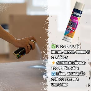 Tinta Spray 400ml Branco Brilhante Uso Geral em Aço Ferro Couro Gesso Cerâmica A Tinta Spray 400ml Branco Brilhante Uso Geral é a solução prática para renovar superfícies de metal, gesso, couro e cerâmica. Ideal para dar vida nova a bicicletas, móveis, eletrodomésticos e objetos em geral, garantindo um acabamento moderno e duradouro. Com fórmula de alta qualidade, oferece excelente aderência e acabamento Brilhante, além de resistência superior contra desgastes do dia a dia. Sua cobertura uniforme realça os detalhes e proporciona um resultado em poucas camadas. Prática e fácil de aplicar, a tinta spray seca ao toque em apenas 15 minutos, permitindo agilidade nos trabalhos e economia de tempo. O rendimento de até 2 m por demão garante maior aproveitamento do produto e ótimo custo-benefício. Diferenciais: Acabamento Brilhante com ótima aderência Alta durabilidade e resistência em ambientes internos e externos Secagem rápida e aplicação prática com cobertura uniforme Especificações TÉCNICAS: Volume: 400ml Rendimento: até 2 m por demão Superfícies indicadas: metal, gesso, couro e cerâmica Secagem: toque em 15 minutos Acabamento: Brilhante Recomendação: uso de primer para melhor desempenho Itens INCLUSOS: 04 Tintas Spray 400ml Branco Brilhante Uso Geral Marca: Não Informado Ean: 7894141437800