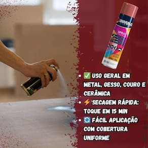 Tinta Spray 400ml Vermelho Uso Geral em Aço Ferro Couro Gesso Cerâmica A Tinta Spray 400ml Vermelho Uso Geral é a solução prática para renovar superfícies de metal, gesso, couro e cerâmica. Ideal para dar vida nova a bicicletas, móveis, eletrodomésticos e objetos em geral, garantindo um acabamento moderno e duradouro. Com fórmula de alta qualidade, oferece excelente aderência e acabamento Brilhante, além de resistência superior contra desgastes do dia a dia. Sua cobertura uniforme realça os detalhes e proporciona um resultado em poucas camadas. Prática e fácil de aplicar, a tinta spray seca ao toque em apenas 15 minutos, permitindo agilidade nos trabalhos e economia de tempo. O rendimento de até 2 m por demão garante maior aproveitamento do produto e ótimo custo-benefício. Diferenciais: Acabamento Brilhante com ótima aderência Alta durabilidade e resistência em ambientes internos e externos Secagem rápida e aplicação prática com cobertura uniforme Especificações TÉCNICAS: Volume: 400ml Rendimento: até 2 m por demão Superfícies indicadas: metal, gesso, couro e cerâmica Secagem: toque em 15 minutos Acabamento: Brilhante Recomendação: uso de primer para melhor desempenho Itens INCLUSOS: 04 Tintas Spray 400ml Vermelho Uso Geral Marca: Não Informado