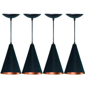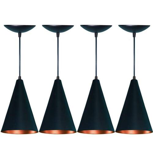 Anúncio referente ao kit de 4 luminárias.Luminária Pendente Cone, fabricada em alumínio, material altamente resistente ao tempo.Luminária composta por cabo PP com 1 metro de comprimento tamanho ajustável , soquete E27, canopla e cúpula em alumínio.Luminária ideal para ambientes internos, utilizada em salas de estar, cozinhas, salas de jantar, área gourmet entre outras.Ilumine e decore o seu lar com nossas lindas luminárias. Deixe a imaginação tomar conta.Lindo pendente para quem gosta de um ambiente com estilo e bem iluminado.Material: Alumínio não enferruja Medidas: 15 cm diâmetro x 25 cm altura mais 1.00 m de caboAltura aproximada montada: 1,25 m Altura ajustável Soquete: E27 aplicável com lâmpada comum ou LED Voltagem: Bivolt 127/220 v Não acompanha: LâmpadaCor Externa: Preto FoscoCor Interna: CobreGarantia: 3 meses de garantia contra defeitos de fabricação. Marca: Estillo & luz