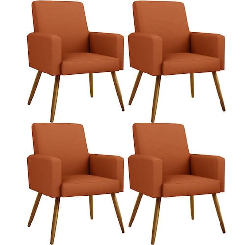 Não é novidade para ninguém que uma boa poltrona precisa ser bastante confortável, com materiais de qualidade e alta durabilidade. O Kit 04 Poltronas Decorativas Para Sala De Estar Maria W01 Pés Palito Tecido Terracota - Lyam Decor vem exatamente com essa proposta, sofisticada e versátil, com certeza irá valorizar ainda mais seu ambiente. As possibilidades para sua disposição são infinitas, seja para escritório, recepção, sala de espera ou estar, entre outras, seu conforto e beleza transformarão sua decoração por inteiro. Cabe mencionar também o revestimento em Facto, que contrasta perfeitamente com os pés palito na cor castanho, dando uma sutil delicadeza à peça. Garanta já a sua!
