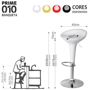 Características Gerais do Produto: - Garantia: 03 Meses Contra de Fabricação - Material da Estrutura da Banqueta: Estrutura em Metal Cromado - Material do Assento: Assento em ABS - Modelo: Banqueta Alta Tulipa com Regulagem de Altura P010 - Altura: 88 cm - Largura: 40 cm - Peso: 5,5 Kg - Profundidade: 30 cm
