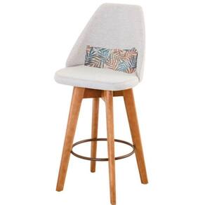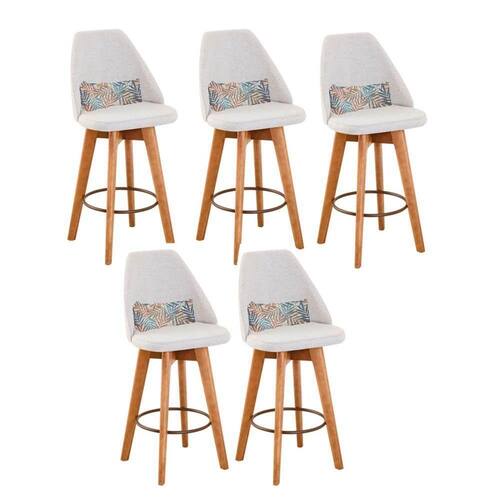 Kit 05 Banquetas Alta Maya Giratória Com Encosto Linho Bege Claro e Almofada Folhas - Aurora Line - Blush