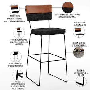 O espetáculo que é o Kit 05 Banquetas Altas Sala Jantar Allana L02 Faixa Couríssimo Camel Linho Chumbo - Lyam Decor vem para agregar ainda mais valor na decoração da sua casa. Sua estrutura em aço remete-nos ao estilo industrial que surgiu em Nova York no século XX, já o assento e encosto estofados trazem equilíbrio e conforto criando a combinação perfeita para o ambiente.