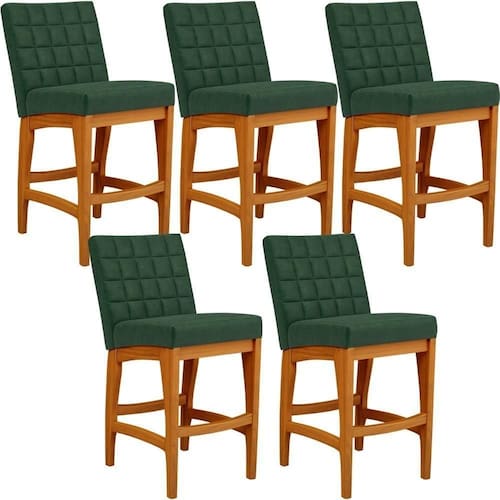 ndo muita excelência, o Kit 05 Banquetas Baixas Para Cozinha Bancada Bar Sala De Jantar 90 cm Fixa Mila L02 Facto Verde Musgo - Lyam Decor é o complemento que faltava para deixar sua casa ainda mais extraordinária. Seu encosto com costura em padrão quadriculado e assento estofados, centralizam em si uma graciosidade estonteante, sem perder todo o seu conforto. A estrutura em madeira, na cor nozes, também é digna de notoriedade, por imprimir bastante personalidade a sua decoração. Vale ressaltar ainda, o apoio para os pés que garante maior segurança à mesma.