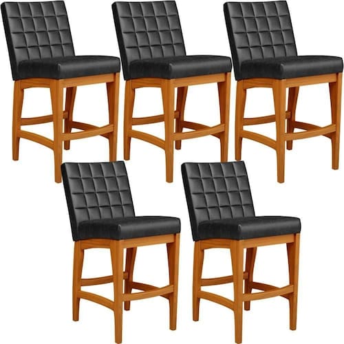 ndo muita excelência, o Kit 05 Banquetas Baixas Para Cozinha Bancada Bar Sala De Jantar 90 cm Fixa Mila L02 Couríssimo Preto - Lyam Decor é o complemento que faltava para deixar sua casa ainda mais extraordinária. Seu encosto com costura em padrão quadriculado e assento estofados, centralizam em si uma graciosidade estonteante, sem perder todo o seu conforto. A estrutura em madeira, na cor nozes, também é digna de notoriedade, por imprimir bastante personalidade a sua decoração. Vale ressaltar ainda, o apoio para os pés que garante maior à mesma.
