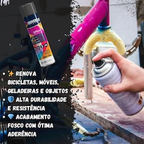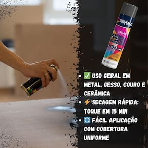 Tinta Spray 400ml Preto Brilhante Uso Geral em Aço Ferro Couro Gesso Cerâmica A Tinta Spray 400ml Preto Brilhante Uso Geral é a solução prática para renovar superfícies de metal, gesso, couro e cerâmica. Ideal para dar vida nova a bicicletas, móveis, eletrodomésticos e objetos em geral, garantindo um acabamento moderno e duradouro. Com fórmula de alta qualidade, oferece excelente aderência e acabamento Brilhante, além de resistência superior contra desgastes do dia a dia. Sua cobertura uniforme realça os detalhes e proporciona um resultado em poucas camadas. Prática e fácil de aplicar, a tinta spray seca ao toque em apenas 15 minutos, permitindo agilidade nos trabalhos e economia de tempo. O rendimento de até 2 m por demão garante maior aproveitamento do produto e ótimo custo-benefício. Diferenciais: Acabamento Brilhante com ótima aderência Alta durabilidade e resistência em ambientes internos e externos Secagem rápida e aplicação prática com cobertura uniforme Especificações TÉCNICAS: Volume: 400ml Rendimento: até 2 m por demão Superfícies indicadas: metal, gesso, couro e cerâmica Secagem: toque em 15 minutos Acabamento: Brilhante Recomendação: uso de primer para melhor desempenho Itens INCLUSOS: 05 Tintas Spray 400ml Preto Brilhante Uso Geral Marca: Não Informado