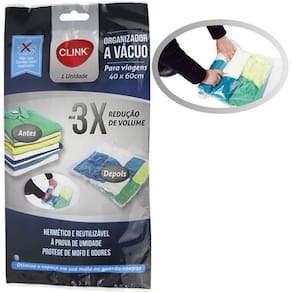 O Saco Organizador a Vácuo da Clink tem como objetivo facilitar sua vida naqueles momentos no qual você precisa de espaço em sua mala, mas não quer deixar nada para trás. O utensílio promete reduzir consideravelmente o volume de suas roupas dando a você mais espaço e facilidade na organização.