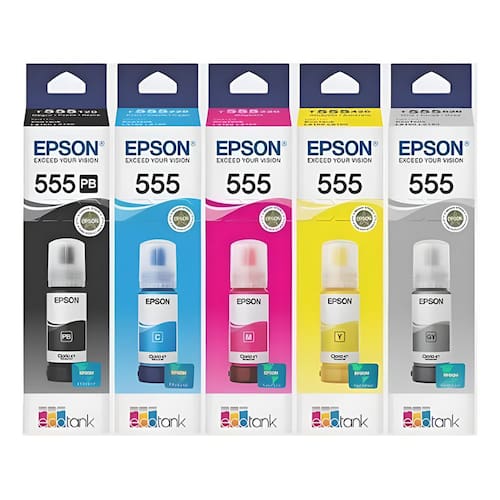 ESPECIFICAÇÕES TÉCNICAS - Marca: Epson - Modelos: T554120 , T555220, T555320, T555420, T555520 - Cores : Preto , Ciano, Magenta, Amarelo, Cinza - Rendimento (em páginas): 2.300 - Volume de cada cartucho de impressão: 70ml - Tecnologia de impressão: Ecotank