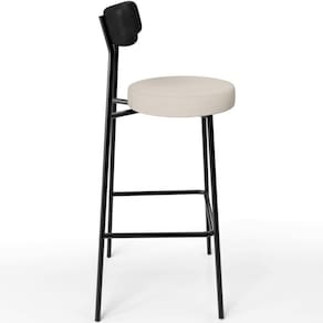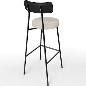 Revestimento do encosto em Couríssimo na cor Preto e assento revestido em Linho na cor Cru, com acabamento semi brilho.