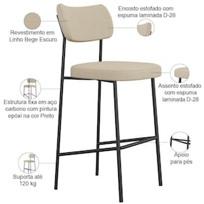 Kit 06 Banquetas Alta Bar Cozinha Sala De Jantar Preto Melina L02 Linho Bege Escuro - Lyam Decor