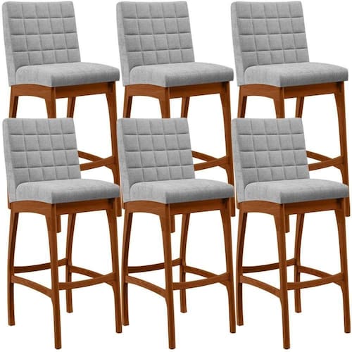 ndo muita excelência, o Kit 06 Banquetas Alta Para Cozinha Sala De Jantar Fixa Mila B04 Bouclê Cinza - Lyam Decor é o complemento que faltava para deixar sua casa ainda mais extraordinária. Seu encosto com costura em padrão quadriculado e assento estofados, centralizam em si uma graciosidade estonteante, sem perder todo o conforto, sendo revestidos pelo riquíssimo tecido em bouclê que por si só já é um espetáculo. A estrutura em madeira, na cor nozes, também é digna de notoriedade, por imprimir bastante personalidade a sua decoração. Vale ressaltar ainda, o apoio para os pés que garante maior à mesma.