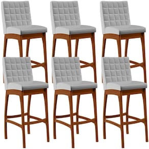 ndo muita excelência, o Kit 06 Banquetas Altas Para Cozinha Sala de Jantar Fixa Mila L02 Facto Cinza Metalizado - Lyam Decor é o complemento que faltava para deixar sua casa ainda mais extraordinária. Seu encosto com costura em padrão quadriculado e assento estofados, centralizam em si uma graciosidade estonteante, sem perder todo o seu conforto. A estrutura em madeira, na cor nozes, também é digna de notoriedade, por imprimir bastante personalidade a sua decoração. Vale ressaltar ainda, o apoio para os pés que garante maior à mesma.