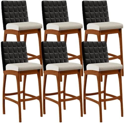 ndo muita excelência, o Kit 06 Banquetas Altas Sala De Jantar Fixa Mila B04 Couríssimo Preto Linho Champagne - Lyam Decor é o complemento que faltava para deixar sua casa ainda mais extraordinária. Seu encosto com costura em padrão quadriculado e assento estofados, centralizam em si uma graciosidade estonteante, sem perder todo o conforto. A estrutura em madeira, na cor nozes, também é digna de notoriedade, por imprimir bastante personalidade a sua decoração. Vale ressaltar ainda, o apoio para os pés que garante maior segurança à banqueta.