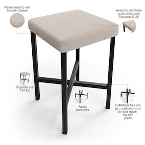 Color: Creme | ColorFamily: Creme | ColorSimple: Creme | ColorSupplier: Creme | Material: Estrutura de aço carbono, Revestimento em Bouclê e espuma | MaterialFamily: Aço carbono e espuma | Model: Stella | OriginCountry: Nacional | OriginState: PR | ProductContents: 06 Banquetas | ProductHeight: 98 cm | ProductInstructions: Produto para uso em ambiente interno, nao devendo ficar exposto ao sol, calor e umidade excessivos. | ProductLength: 37 cm | ProductWarranty: 90 dias após o recebimento do produto | ProductWeight: 24 kg | ProductWidth: 39 cm | SizeDescription: Altura: 98 cm x Largura: 39 cm x Profundidade: 37 cm | SupplierSimpleName: Kit 06 Banquetas Baixa Bar Cozinha Sala De Jantar Preto Stella L02 Bouclê Creme - Lyam Decor