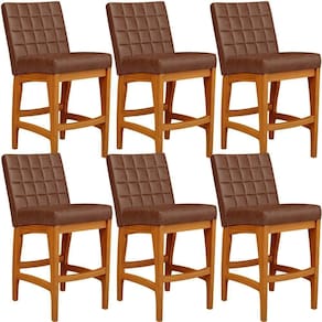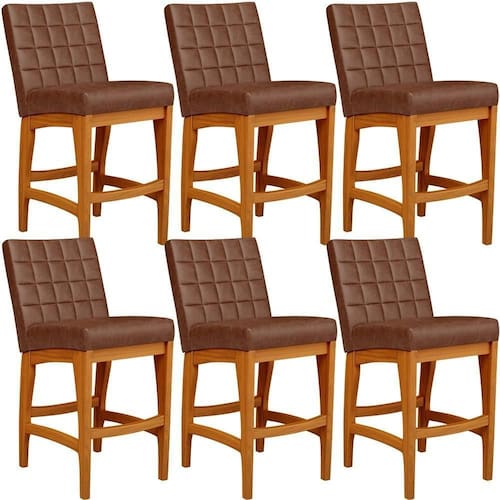 ndo muita excelência, o Kit 06 Banquetas Baixas Para Cozinha Bancada Bar Sala De Jantar 90 cm Fixa Mila L02 Couríssimo Marrom - Lyam Decor é o complemento que faltava para deixar sua casa ainda mais extraordinária. Seu encosto com costura em padrão quadriculado e assento estofados, centralizam em si uma graciosidade estonteante, sem perder todo o seu conforto. A estrutura em madeira, na cor nozes, também é digna de notoriedade, por imprimir bastante personalidade a sua decoração. Vale ressaltar ainda, o apoio para os pés que garante maior à mesma.