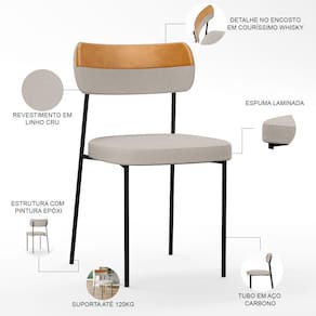 Encosto e assento estofados com espuma laminada, revestidos em Linho Cru e Couríssimo Whisky .
