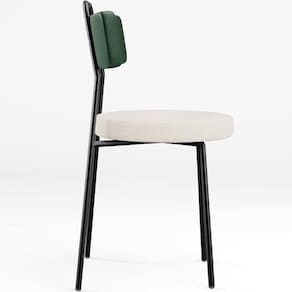 Revestimento do encosto em Facto na cor Verde Musgo e do assento em Linho na cor Cru, com acabamento semi brilho.