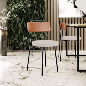 Revestimento do encosto em Couríssimo na cor Camel e do assento em Linho na cor Bege, com acabamento semi brilho.