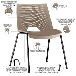 Encosto e assento monobloco, com material injetado em Polipropileno (PP), na tonalidade Nude.