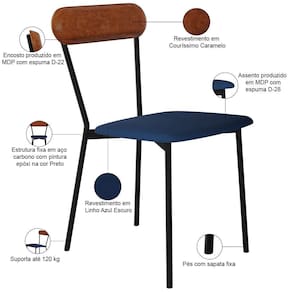 ColorSupplier: Caramelo | Material: Estrutura em Aço e MDP, Revestimento em Linho e espuma | ProductLength: 53 cm | OriginCountry: | ProductWeight: 5,5 kg | É cadeira de balanço: Não | Firmeza: Firme | Peso máximo suportado: 120 kg | Fabricante: Lyam Decor | Cor: Caramelo | ProductWidth: 43 cm | SupplierSimpleName: Kit 06 Cadeiras Estofada Para Sala de Jantar Liora Preto C01 Linho Azul Courino Caramelo - Lyam Dec | É empilhável: Não | Espessura do assento: na | MaterialFamily: Aço, MDP, Linho e espuma | SizeDescription: Altura: 243 cm x Largura: 43 cm x Profundidade: 53 cm | Tempo de montagem: na | ColorFamily: Caramelo | ProductHeight: 243 cm | ProductContents: 06 Cadeiras | É dobrável: Não | Cor do estofamento: AzulCaramelo | Model: Liora | ProductWarranty: 90 dias após o do produto | OriginState: PR | Requer montagem: Não | Largura da cadeira: 43 cm | Color: Caramelo | ColorSimple: Caramelo | ProductInstructions: Produto para uso em ambiente interno, nao devendo ficar exposto ao sol, calor e umidade excessivos. | Desenho do tecido: Liso | Cor da estrutura da cadeira: Preto | Cor do assento: Caramelo | Material do estofamento: Espuma D-22 e D-28 | Altura da cadeira: 243 cm | Profundidade da cadeira: 53 cm | Profundidade do assento: 53 cm | Largura do assento: 43 cm | Altura do assento a partir do solo: 49 cm