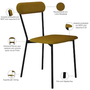 ProductWidth: 43 cm | Cor da estrutura da cadeira: Preto | ProductWeight: 5,5 kg | Largura da cadeira: 43 cm | OriginState: PR | ProductHeight: 243 cm | Profundidade do assento: 53 cm | ProductWarranty: 90 dias após o do produto | Altura da cadeira: 243 cm | Desenho do tecido: Liso | Firmeza: Firme | SupplierSimpleName: Kit 06 Cadeiras Estofada Para Sala de Jantar Liora Preto C01 Linho Mostarda - Lyam Decor | ProductInstructions: Produto para uso em ambiente interno, nao devendo ficar exposto ao sol, calor e umidade excessivos. | Material do estofamento: Espuma D-22 e D-28 | Profundidade da cadeira: 53 cm | Peso máximo suportado: 120 kg | ProductContents: 06 Cadeiras | É cadeira de balanço: Não | Cor do assento: Mostarda | Altura do assento a partir do solo: 49 cm | Espessura do assento: na | Cor: Mostarda | Color: Amarelo | ColorFamily: Mostarda | ColorSimple: Amarelo | ColorSupplier: Mostarda | Cor do estofamento: Mostarda | Fabricante: Lyam Decor | Material: Estrutura em Aço e MDP, Revestimento em Linho e espuma | MaterialFamily: Aço, MDP, Linho e espuma | Model: Liora | OriginCountry: | SizeDescription: Altura: 243 cm x Largura: 43 cm x Profundidade: 53 cm | ProductLength: 53 cm | É dobrável: Não | É empilhável: Não | Requer montagem: Não | Tempo de montagem: na | Largura do assento: 43 cm
