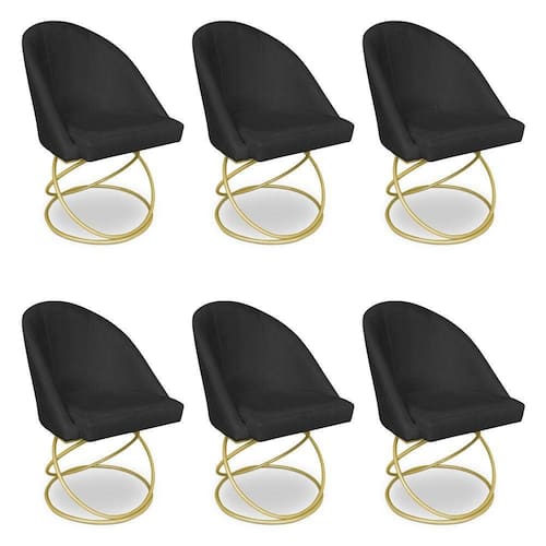 Kit 06 Cadeiras Poltrona De Jantar Bela Veludo Preto Base Metálica Luxo Dourado - Pallazio