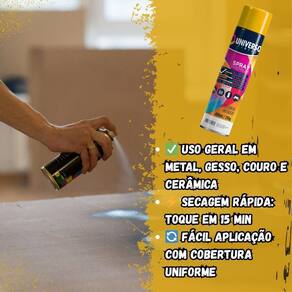 Tinta Spray 400ml Amarelo Uso Geral em Aço Ferro Couro Gesso Cerâmica A Tinta Spray 400ml Amarelo Uso Geral é a solução prática para renovar superfícies de metal, gesso, couro e cerâmica. Ideal para dar vida nova a bicicletas, móveis, eletrodomésticos e objetos em geral, garantindo um acabamento moderno e duradouro. Com fórmula de alta qualidade, oferece excelente aderência e acabamento Brilhante, além de resistência superior contra desgastes do dia a dia. Sua cobertura uniforme realça os detalhes e proporciona um resultado em poucas camadas. Prática e fácil de aplicar, a tinta spray seca ao toque em apenas 15 minutos, permitindo agilidade nos trabalhos e economia de tempo. O rendimento de até 2 m por demão garante maior aproveitamento do produto e ótimo custo-benefício. Diferenciais: Acabamento Brilhante com ótima aderência Alta durabilidade e resistência em ambientes internos e externos Secagem rápida e aplicação prática com cobertura uniforme Especificações TÉCNICAS: Volume: 400ml Rendimento: até 2 m por demão Superfícies indicadas: metal, gesso, couro e cerâmica Secagem: toque em 15 minutos Acabamento: Brilhante Recomendação: uso de primer para melhor desempenho Itens INCLUSOS: 06 Tintas Spray 400ml Amarelo Uso Geral