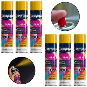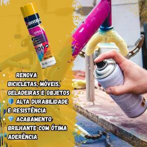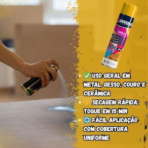 Tinta Spray 400ml Amarelo Uso Geral em Aço Ferro Couro Gesso Cerâmica A Tinta Spray 400ml Amarelo Uso Geral é a solução prática para renovar superfícies de metal, gesso, couro e cerâmica. Ideal para dar vida nova a bicicletas, móveis, eletrodomésticos e objetos em geral, garantindo um acabamento moderno e duradouro. Com fórmula de alta qualidade, oferece excelente aderência e acabamento Brilhante, além de resistência superior contra desgastes do dia a dia. Sua cobertura uniforme realça os detalhes e proporciona um resultado em poucas camadas. Prática e fácil de aplicar, a tinta spray seca ao toque em apenas 15 minutos, permitindo agilidade nos trabalhos e economia de tempo. O rendimento de até 2 m por demão garante maior aproveitamento do produto e ótimo custo-benefício. Diferenciais: Acabamento Brilhante com ótima aderência Alta durabilidade e resistência em ambientes internos e externos Secagem rápida e aplicação prática com cobertura uniforme Especificações TÉCNICAS: Volume: 400ml Rendimento: até 2 m por demão Superfícies indicadas: metal, gesso, couro e cerâmica Secagem: toque em 15 minutos Acabamento: Brilhante Recomendação: uso de primer para melhor desempenho Itens INCLUSOS: 06 Tintas Spray 400ml Amarelo Uso Geral Marca: Não Informado