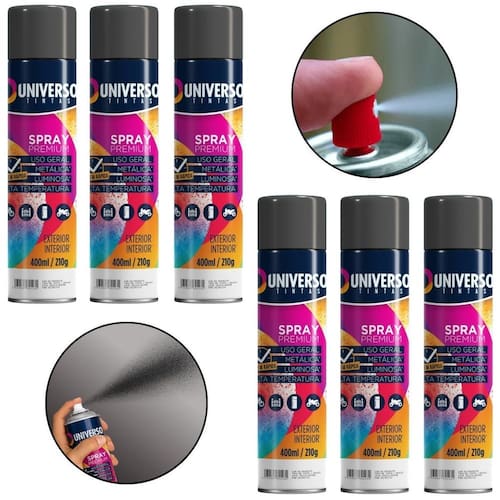 Tinta Spray 400ml Preto Brilhante Uso Geral em Aço Ferro Couro Gesso Cerâmica A Tinta Spray 400ml Preto Brilhante Uso Geral é a solução prática para renovar superfícies de metal, gesso, couro e cerâmica. Ideal para dar vida nova a bicicletas, móveis, eletrodomésticos e objetos em geral, garantindo um acabamento moderno e duradouro. Com fórmula de alta qualidade, oferece excelente aderência e acabamento Brilhante, além de resistência superior contra desgastes do dia a dia. Sua cobertura uniforme realça os detalhes e proporciona um resultado em poucas camadas. Prática e fácil de aplicar, a tinta spray seca ao toque em apenas 15 minutos, permitindo agilidade nos trabalhos e economia de tempo. O rendimento de até 2 m por demão garante maior aproveitamento do produto e ótimo custo-benefício. Diferenciais: Acabamento Brilhante com ótima aderência Alta durabilidade e resistência em ambientes internos e externos Secagem rápida e aplicação prática com cobertura uniforme Especificações TÉCNICAS: Volume: 400ml Rendimento: até 2 m por demão Superfícies indicadas: metal, gesso, couro e cerâmica Secagem: toque em 15 minutos Acabamento: Brilhante Recomendação: uso de primer para melhor desempenho Itens INCLUSOS: 06 Tintas Spray 400ml Preto Brilhante Uso Geral Marca: Não Informado