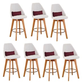 Kit 07 Banquetas Alta Maya Giratória Com Encosto Linho Bege Claro E Almofada Corino Bordô - Gat Magazine Banqueta Maya Giratória - GAT MAGAZINE A Banqueta Maya possui assento e pés em madeira eucalipto com sistema giratório! Os pés contam com um reforço que proporciona um suporte de peso de até 120 Kgs.O assento é revestido com espuma D-23. Além de bonita e charmosa, vai trazer para seu ambiente elegância e proporcionará conforto para sua família e amigos nos momentos de lazer.