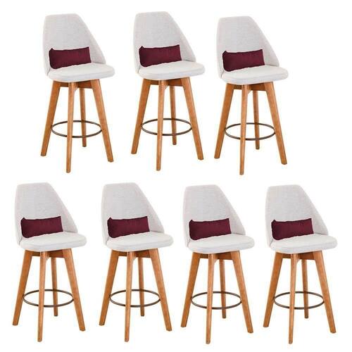 Kit 07 Banquetas Alta Maya Giratória Com Encosto Linho Bege Claro E Almofada Sintético Bordô - Gat Magazine