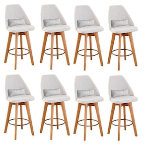 Kit 08 Banquetas Alta Maya Giratória Com Encosto Gourmet Linho Bege E Almofada Corino Branco - Aurora Line Banqueta Maya Giratória - Aurora Line A Banqueta Maya possui assento e pés em madeira eucalipto com sistema giratório! Os pés contam com um reforço que proporciona um suporte de peso de até 120 Kgs.O assento é revestido com espuma D-23. Além de bonita e charmosa, vai trazer para seu ambiente elegância e proporcionará conforto para sua família e amigos nos momentos de lazer.