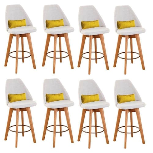 Kit 08 Banquetas Alta Maya Giratória Com Encosto Linho Bege Claro E Almofada Sintético Amarelo - Aurora Line Banqueta Maya Giratória - Aurora Line A Banqueta Maya possui assento e pés em madeira eucalipto com sistema giratório! Os pés contam com um reforço que proporciona um suporte de peso de até 120 Kgs.O assento é revestido com espuma D-23. Além de bonita e charmosa, vai trazer para seu ambiente elegância e proporcionará conforto para sua família e amigos nos momentos de lazer.