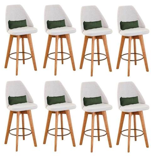 Kit 08 Banquetas Alta Maya Giratória Com Encosto Linho Bege Claro E Almofada Suede Verde Musgo - Gat Magazine Banqueta Maya Giratória - GAT MAGAZINE A Banqueta Maya possui assento e pés em madeira eucalipto com sistema giratório! Os pés contam com um reforço que proporciona um suporte de peso de até 120 Kgs.O assento é revestido com espuma D-23. Além de bonita e charmosa, vai trazer para seu ambiente elegância e proporcionará conforto para sua família e amigos nos momentos de lazer.