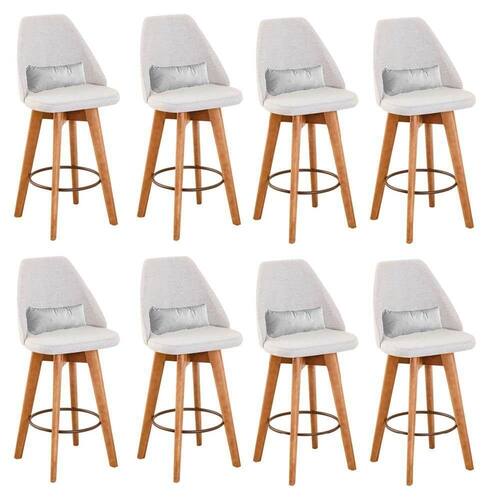 Kit 08 Banquetas Alta Maya Giratória Com Encosto Gourmet Linho Bege E Almofada Suede Branco - Gat Magazine Banqueta Maya Giratória - GAT MAGAZINE A Banqueta Maya possui assento e pés em madeira eucalipto com sistema giratório! Os pés contam com um reforço que proporciona um suporte de peso de até 120 Kgs.O assento é revestido com espuma D-23. Além de bonita e charmosa, vai trazer para seu ambiente elegância e proporcionará conforto para sua família e amigos nos momentos de lazer.