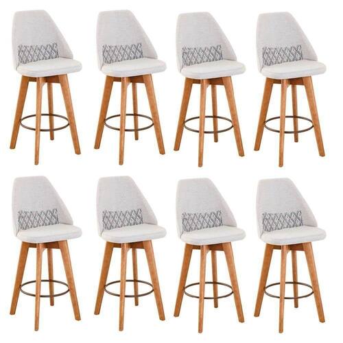 Kit 08 Banquetas Alta Maya Giratória Com Encosto Gourmet Linho Bege E Almofada Zigzag - Gat Magazine Banqueta Maya Giratória - GAT MAGAZINE A Banqueta Maya possui assento e pés em madeira eucalipto com sistema giratório! Os pés contam com um reforço que proporciona um suporte de peso de até 120 Kgs.O assento é revestido com espuma D-23. Além de bonita e charmosa, vai trazer para seu ambiente elegância e proporcionará conforto para sua família e amigos nos momentos de lazer.