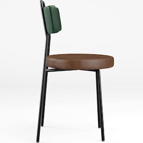 Revestimento do encosto em Facto na cor Verde Musgo e do assento em Couríssimo na cor Marrom, com acabamento semi brilho.