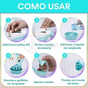 Com formato de golfinho super fofo, esta máquina de bolhas também será a melhor amiga de seus filhos. E se você estiver comemorando uma festa de aniversário, as bolhas são exatamente o que você precisa para dar vida à festa. Um presente bolhudo perfeito para animar ainda mais a criançada. Imagine a felicidade do seu filho(a) quando ganhar de presente Golfinho Bolhudo de presente