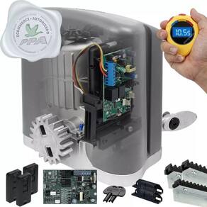 CARACTERÍSTICAS DO MOTOR • Potência de 0,25 ou 1/4 CV (portões até 400kg balanceado) • Motor: Monofásico 60Hz • Potência nominal (consumo): 127V - 370W / 220V - 515W • Consumo (A): 2,86A - 127V / 2,15A - 220V • Peso do portão: 400Kg • Redução: 1:23 • Abre portão de 3m em 10,6 seg. • Suporta até 30 aberturas por hora (ciclos/hora) • Rotação do motor 1740 RPM • Capacitor: 127V - 25µF / 220V - 12µF • Fim de curso Analógico (Reed Switch) • Engrenagem externa 18 dentes em alumínio (Turbo) • Coroa interna de Nylon com alma metálica • Placa Eletrônica de Comando PPA