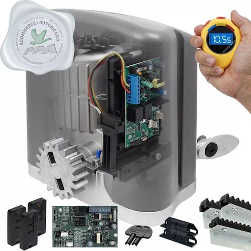 ITENS INCLUSOS 01 Motor PPA DZ Rio 400 KL Z18 1/4HP 01 Placa Eletrônica de Comando (testada e codificada com os controles) 01 Capacitor 01 Conjunto de Sensor fim de curso (Instalado) 02 Ímãs com suporte para o sensor fim de curso 03 Metros de cremalheira (50cm cada barra) 03 Controles pretos c/ suporte (testados e codificados com a placa) 02 Chaves de destravamento 01 Manual de operações