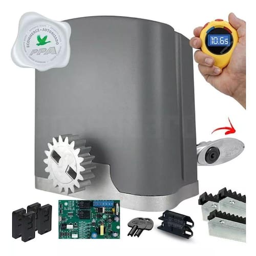 ITENS INCLUSOS 01 Motor PPA DZ Rio 400 KL Z18 1/4HP 01 Placa Eletrônica de comando PPA (testada e codificada com os controles) 01 Capacitor 01 Conjunto de Sensor fim de curso (Instalado) 02 Ímãs com suporte para o sensor fim de curso 03 Metros de cremalheira (50cm cada barra) 04 Controles pretos c/ suporte (testados e codificados com a placa) 02 Chaves de destravamento 01 Manual de operações